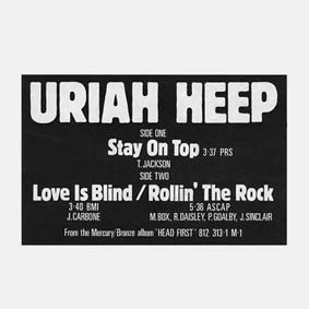 Gypsy (edit/stereo) / same (edit/mono) (U.S, released 1970) Mercury DJ 262 -no picture sleeve- Wake Up (Set Your Sights) (edit/stereo) / same (edit/mono) U.S. 1970 Mercury DJ 294 -no picture sleeve- High Priestess (edit/stereo) / same (edit/mono) (U.S., released 1971) Mercury DJ 312 -no picture sleeve- Salisbury (edit/stereo) / same (edit/mono) (U.S., released 1971) Mercury DJ 320 -no picture sleeve- Look At Yourself (edit/stereo) / same (edit/mono) (U.S., released 1971) Mercury DJ 333 -no picture sleeve- I Wanna Be Free / What Should Be Done (U.S., released 1971) Mercury DJ 336 -no picture sleeve- ELP: Lucky Man / Uriah Heep: Look At Yourself (Spain, released 1971) Island 0001The Wizard / Why (U.S., released 1972) Mercury 73271 -no picture sleeve- Easy Livin' / All My Life (U.S., released 1972) Mercury 73307 -no picture sleeve- Sweet Lorraine (edit) / Blind Eye (U.S., released 1972) Mercury 73349 -no picture sleeve- July Morning part 1 (edit/live) / same part 2 (edit/live) (U.S., released 1973) Mercury DJ 374 -no picture sleeve- Stealin' (edit/stereo) / same (edit/mono) (U.S., released 1973) Warner WB 7738 -no picture sleeve- Something Or Nothing (stereo) / same (mono) (U.S., released 1974) Warner WB 7836 -no picture sleeve- Prima Donna (stereo) / same (mono) (U.S., released 1975) Warner WBS 8132 -no picture sleeve- Silver White Man (David Byron) / Sweet Lorraine (edit) (U.S., released 1975) Mercury 73794 -no picture sleeve- THE REST OF URIAH HEEP (Holland 33 1/3 prm EP, released 1976) The Time Will Come - What Can I Do / Simon The Bullet Freak - Sunshine Bronze UH1